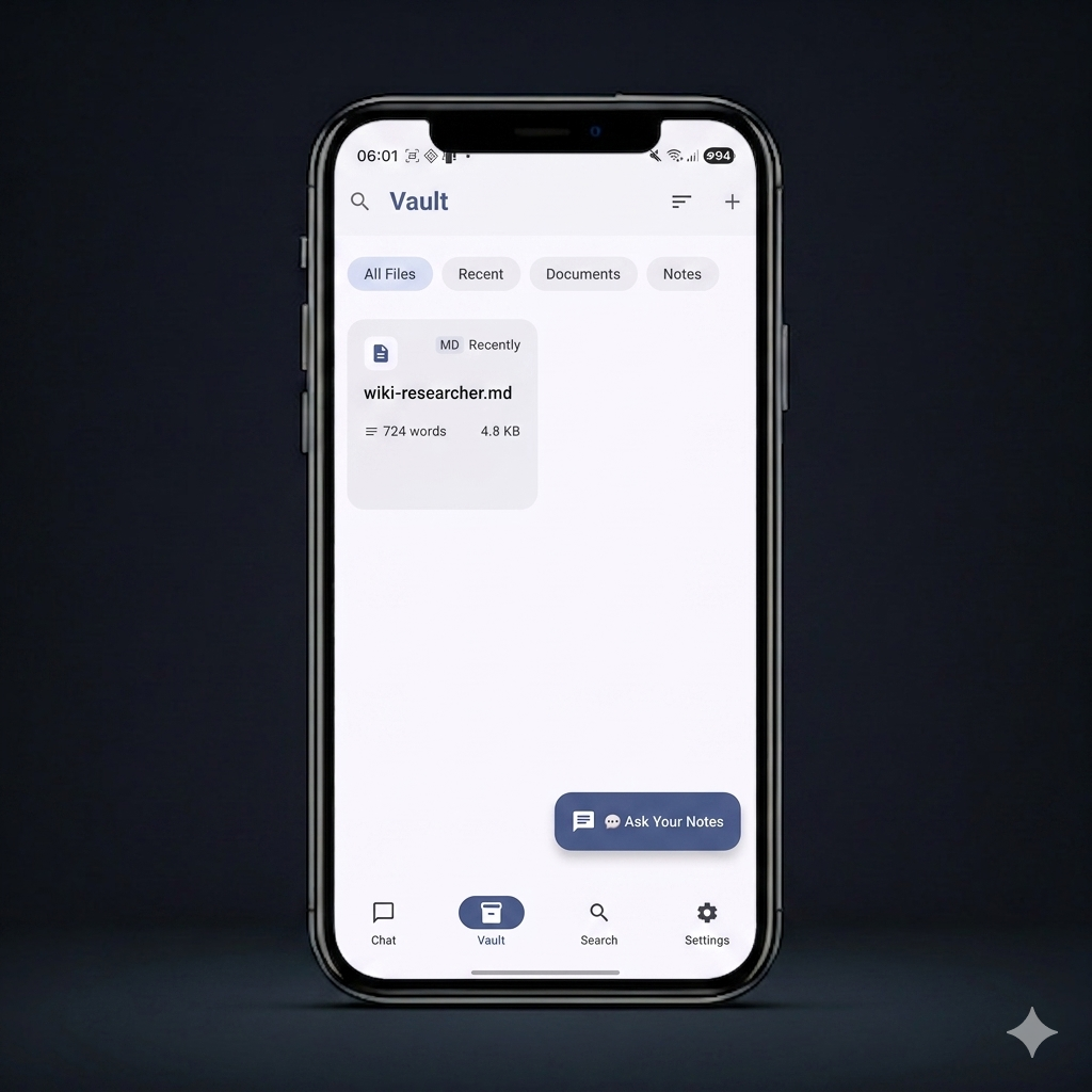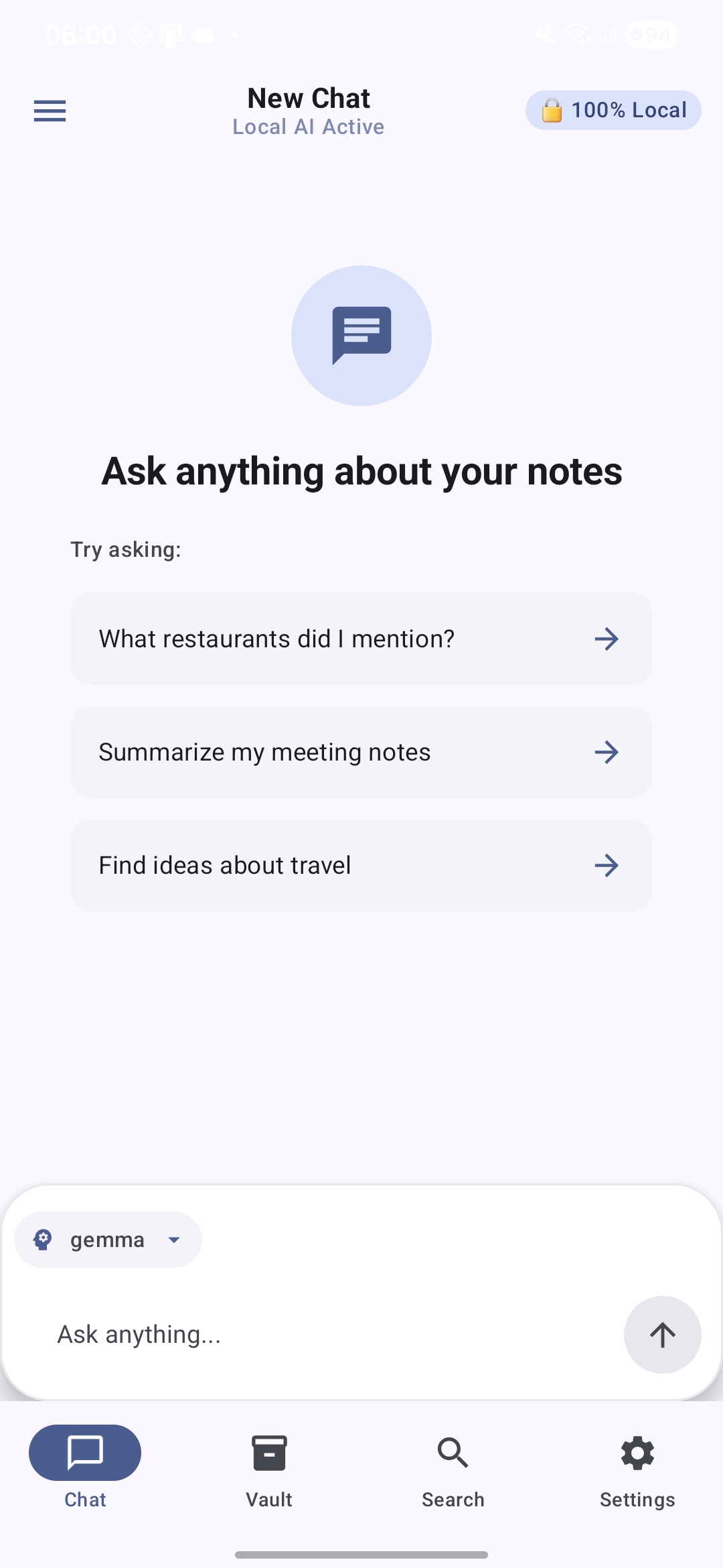 When you chat with your notes, your phone uses a small, open-weight model downloaded once. After that, everything happens locally: embeddings, vector search, response generation — all on your device.